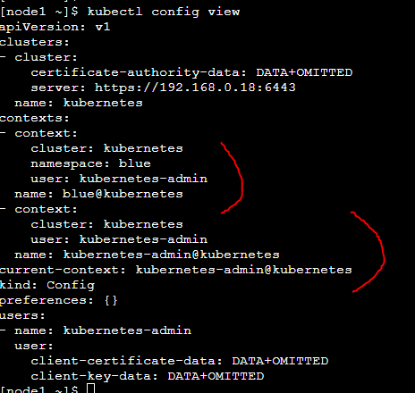 [node1 ~]$ kubectl config set-context blue@kubernetes --cluster=kubernetes --user=kubernetes-admin --namespace=blue